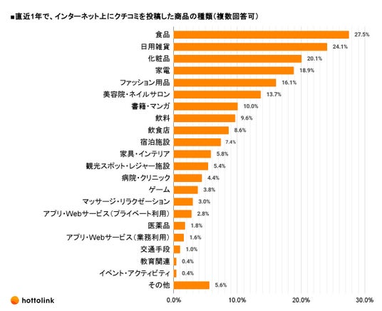 (4)で「ある」と答えたユーザーに、直近1年で、インターネット上にクチコミを投稿した商品やサービスを聞いたところ、「食品」が27.5%、「日用雑貨」が24.1%、「化粧品(スキンケア、メイクアップ)」が20.1%で上位を占めました。