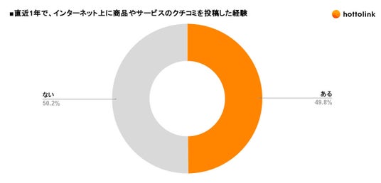直近1年で、インターネット上に商品やサービスのクチコミを投稿した経験を聞いたところ、「あり」が49.8%、「ない」50.2%で、ほぼ同率となりました。