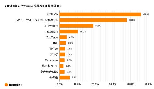 (4)で「ある」と答えたユーザーに、直近1年のクチコミ投稿先を聞いたところ、「ECサイト」が46.0%、「レビューサイト・クチコミ投稿サイト」が38.0%、「X(旧Twitter)」が19.1%で上位を占めました。