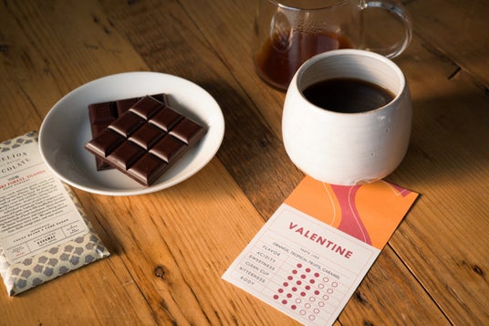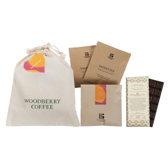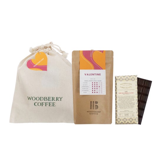 本年のウッドベリーコーヒーのバレンタインギフトには、コーヒーとのペアリングを考えて開発したオリジナルの「バレンタインブレンド」と、サンフランシスコ発のBean to Bar チョコレート専門店、ダンデライオン・チョコレートさんのチョコレートバー「セムリキ・フォレスト, ウガンダ70%」をセットにしたギフトをご用意しました。