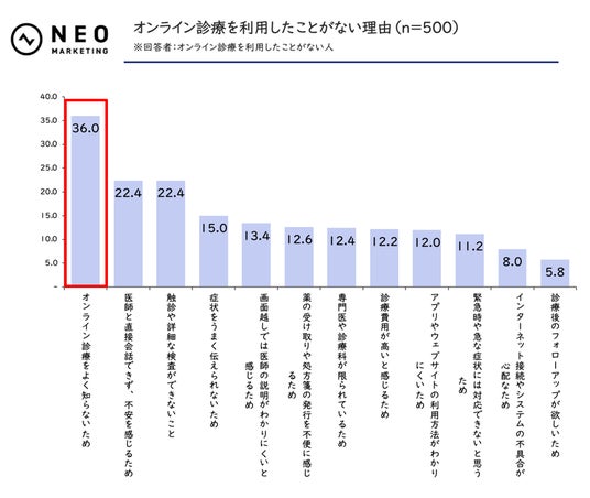 「オンライン診療をよく知らないため」が36.0%で、2番手と10ポイント以上もの差をつけてトップとなりました。オンライン診療の存在は知っているものの、進め方の手順や雰囲気がわからないため敬遠している、という層が一定数いそうです。