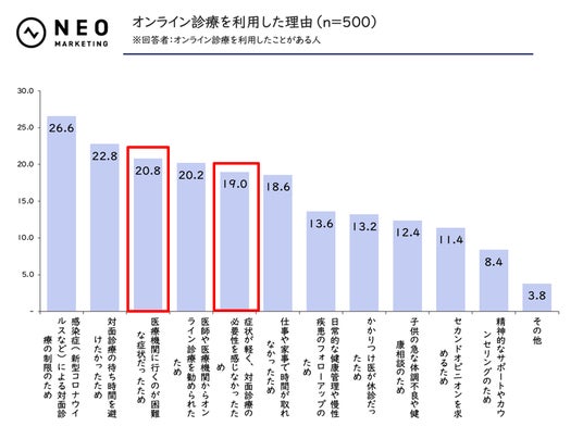 「感染症(新型コロナウイルスなど)による対面診療の制限のため」が26.6%で最多となりました。