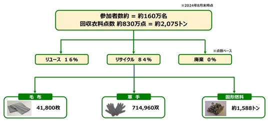 オンワードグループのサステナブル経営推進の一環として、ご愛用いただいた自社の衣料品を回収し、リユース・リサイクルを通じて、衣料品循環システムの構築を目指す取り組みです。2009年にスタートし、2024年度上期までで、累計約160万名のお客さまから約830万点の衣料品を回収しました。