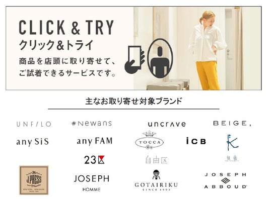 オープンにあわせ、オンワード公式オンラインストア「オンワード・クローゼット」で扱っているアイテムを店頭で試着でき、その場で購入ができる「クリック&トライ」サービスで、メンズアイテムの取り扱いをスタートいたします。従来の店頭顧客にはブランドの垣根を越えた商品のご紹介を、ECサイト顧客には実店舗の接客を体験していただくなど、実店舗とECサイトの利点を融合させたショップでファッションをお楽しみいただくご提案をいたします。