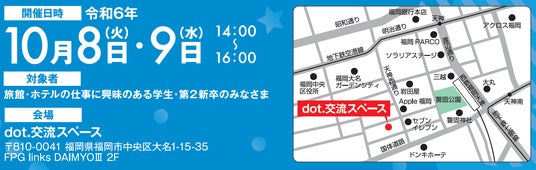 大分県の宿泊企業が、学生、第2新卒者を対象に、旅館やホテルならではの魅力発信を、福岡市中央区大名のカフェで開催する。通常の企業説明会と異なり、交流会形式で緊張なく気軽な雰囲気の中で行う。