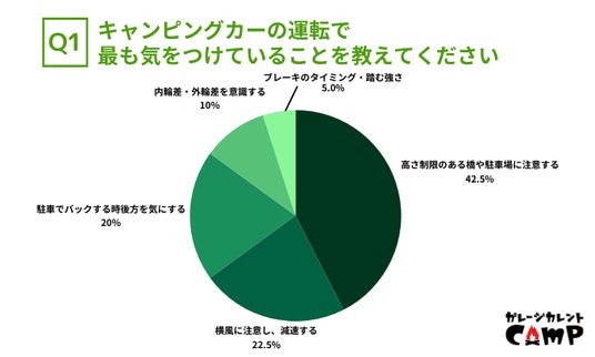 キャンピングカーの運転で最も気をつけていることを聞いてみると、最も多かった回答が「高さ制限のある橋や駐車場に注意する」で42.5%でした。