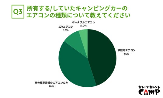 夏に欠かせないエアコン。キャンピングカーに装備しているエアコンの種類について聞いてみると、「家庭用エアコン」が45.0%を占めていることがわかりました。冷房能力が低いとキャンピングカー全体を冷やすことは難しいですが、家庭用エアコンであれば十分に冷却できます。
