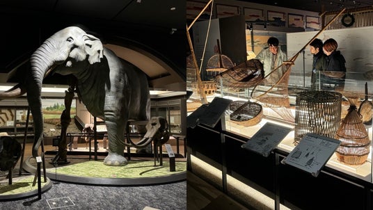 暗い展示室に照らし出されるツダンスキーゾウ(左)と学芸員から国の有形民俗文化財に登録された漁具の解説を受ける支援者。