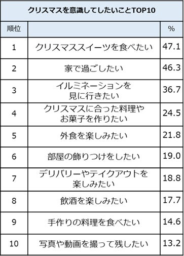 ※提示した選択肢:クリスマススイーツを食べたい、家で過ごしたい、イルミネーションを見に行きたい、意識することはない、クリスマスに合った料理やお菓子を作りたい、外食を楽しみたい、部屋の飾りつけをしたい、デリバリーやテイクアウトを楽しみたい、飲酒を楽しみたい、手作りの料理を食べたい、写真や動画を撮って残したい、クリスマスイベントに参加したい、クリスマス期間の演出をしたテーマパークに行きたい、繁華街に繰り出したい、SNS等に楽しんでいる様子を投稿したい、オンラインで飲み会や食事会がしたい、その他(自由回答)
