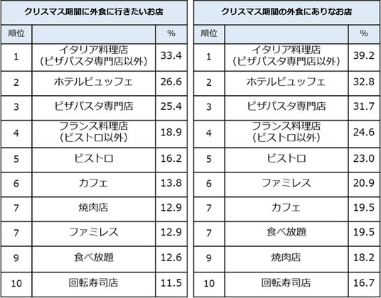 「クリスマス期間にクリスマスを意識した外食をする際、どんなお店に行きたいですか?」という質問では、イタリア料理やフランス料理といったおしゃれなお店が上位に入る一方で、焼肉や回転寿司といった「プチ贅沢」な業態も上位にランクイン。また、「行くのはありだと思うのはどんなお店ですか?」に対する回答を見てみると、「ファミレス」(20.9%)、「カフェ」(19.5%)など、普段から利用しているようなお店も「クリスマスの食事に『あり』」だと考えている人が一定数いることがわかりました。
