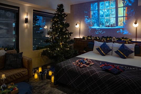 2.クリスマス仕様の客室:ツリーやキャンドル、スプレーアートで飾られた特別仕様の客室。オーナメントをご用意しますので、ツリーの飾りつけをお楽しみください。プロジェクターで映画もお楽しみいだけます。
