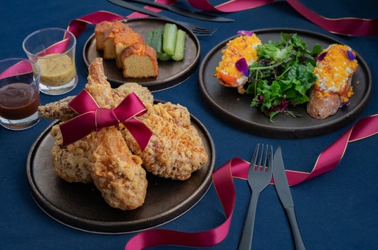スパイスやハーブと一緒にバーボンウイスキーに漬け込み、2日間かけて仕上げるシェフこだわりのオリジナルチキンは、芳醇で深みのある味わいが特徴です。2種のディップソースはチキンの魅力をさらに引き立て、食べ進めるたびに味の変化を楽しめます。付け合わせには、シーザー風スモークサーモンのタルティーヌや、ほんのり甘いコーンブレッドなどボリューム満点でご用意します。期間限定のオリジナルチキンプレートを客室でゆっくりお楽しみください。