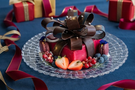 大胆なチョコレートのリボンが飾られ、まるで贈り物のようなデザインが目を引くクリスマスケーキ「プリザン・ノエル」。ラズベリーとピスタチオの2層のムースの贅沢で深い味わいを楽しめます。シェフが心を込めて作り上げたケーキが、クリスマスならではの高揚感溢れる幸せなひとときをお届けします。ケーキの周りを彩るマカロンやフルーツも一緒にお楽しみください。