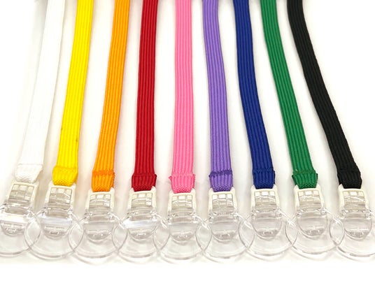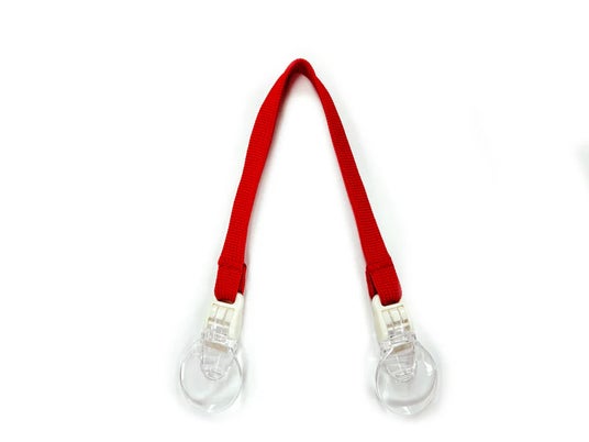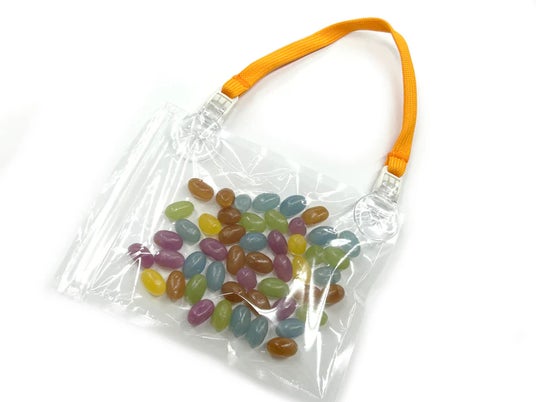 紐の両端に自社オリジナルの透明の丸型クリップがついたグミ専用ホルダー