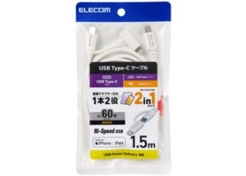 <2in1ケーブル(USB-C - USB-C/Lightning変換/MFi認証) 1.5m・ホワイト>