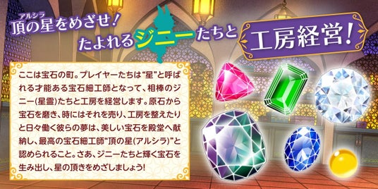 工房主とジニーたちの夢は、磨きあげた逸品を宝石の殿堂に献納、名声を高めて最高の宝石細工師“頂の星(アルシラ)”と認められること。どの宝石を売って資金にし、どの宝石を献納して名声に換えるのかあなたの経営判断が問われます。さあ、星の頂きをめざし、ジニーたちと工房経営です!