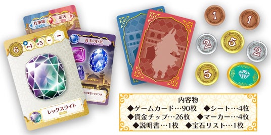 ■内容物:ゲームカード 90枚/シート 4枚/資金チップ 26枚/マーカー 4枚/説明書 1枚/宝石リスト 1枚