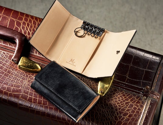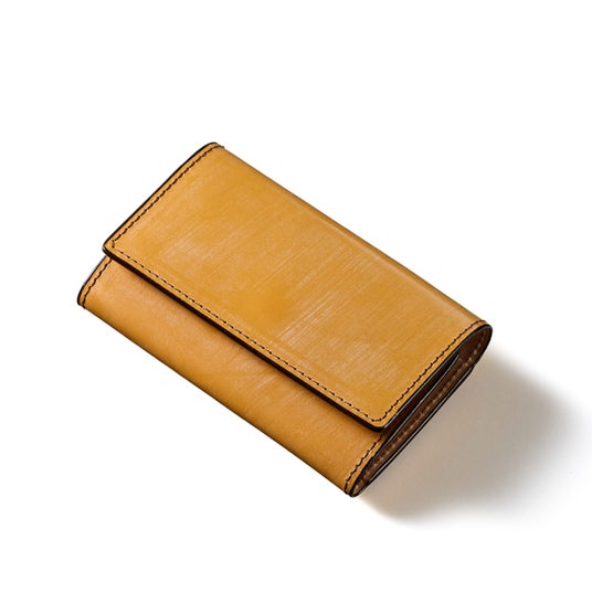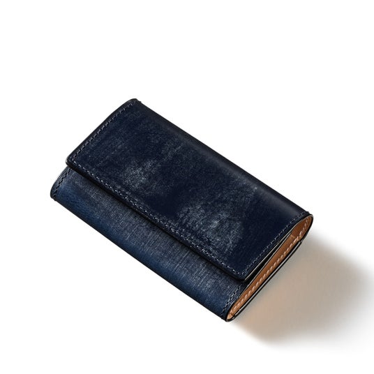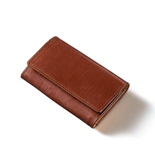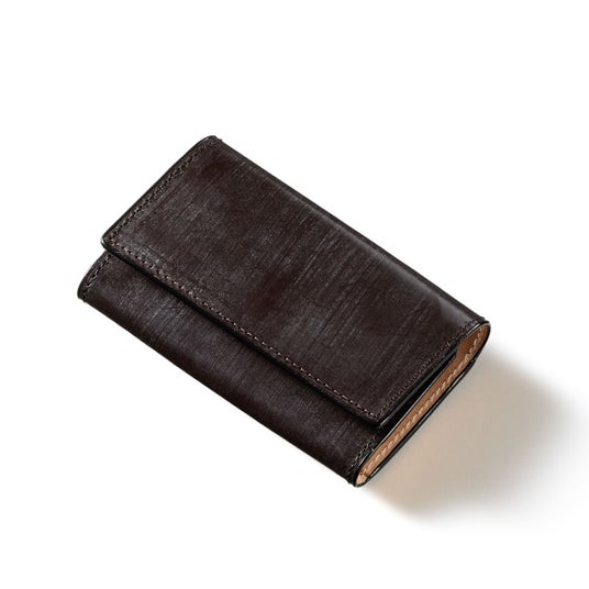 英国馬具革ブライドルレザーと欧州ヌメ革のコンビネーションは、高級感溢れるブライドルの良さと、素朴で温かみあるヌメ革の魅力を同時に味わえます。革を折りたたむタイプのキーケースです。重厚かつ堅牢なフォルムが魅力で、金具もブラック色を採用することでシックな大人の雰囲気をお楽しみいただけます。