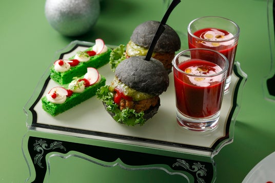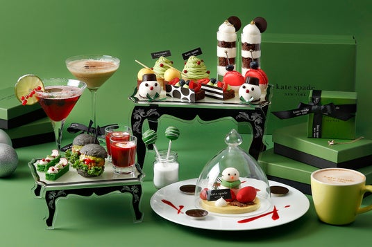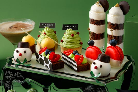アフタヌーンティーは、ケイト・スペード ニューヨークのブランドカラーやドット・ストライプなどのブランドコードからインスピレーションをうけたスイーツ7種とセイボリー3種がスタンドを彩ります。また、ニューヨークのホリデーシーズンをイメージし、スノードームに佇むスノーマンが目を惹くスペシャルデザート、ケイト・スペード ニューヨークのロゴのアートを施したカフェラテ、ホリデーらしいシックなカラーやボウのデコレーションが上品なカクテルなど、オプションメニューも揃えました。