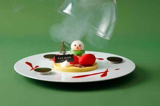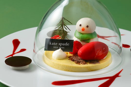 ニューヨークのホリデーをイメージし、スノードームに佇む愛らしいスノーマンが目を惹くスペシャルデザート。プレートにはケイト・スペード ニューヨークのデザインからインスピレーションをうけたドットを配し、食感を楽しめるピスタチオムースやラズベリーアイス、スノーマンのミルクチョコレートをのせた遊び心溢れるスペシャリテ。グラスのカバーをとった瞬間に香るアロマとともにお楽しみください。
