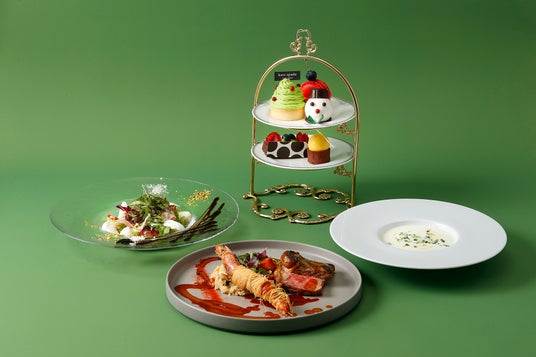 前菜やメインディッシュはお好みのメニューをお選びいただくプリフィックスコース に、デザートはミニサイズのアフタヌーンティースタンドにスイーツをのせてご用意。スタンドには5種のケイト・スペード ニューヨーク コラボレーションアフタヌーンティースイーツをのせ、お食事もアフタヌーンティーもお楽しみいただけるコースです。