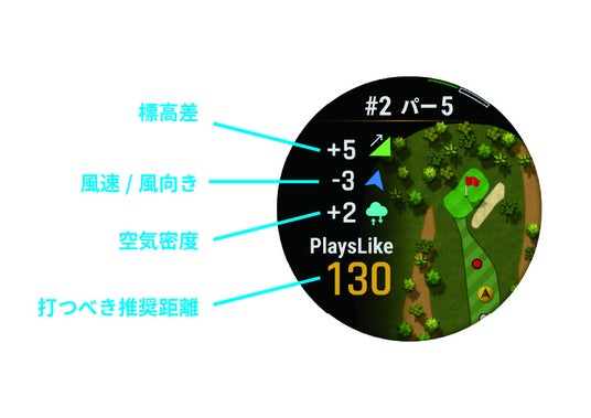 ※風速/風向き、空気密度の考慮には「Garmin Golf」アプリとのペアリングが必要です。