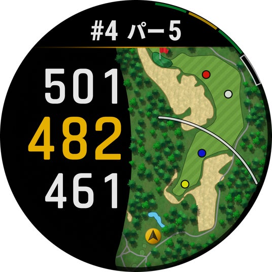 1. 色鮮やかなディスプレイフルカラータッチスクリーン(1.4インチ)は、直射日光下でも見やすい色鮮やかな解像度が高いAMOLED(有機EL)ディスプレイを採用。コースレイアウトマップは林のエリアが立体的に表示され、よりリアルにコースをイメージしやすくなっています。