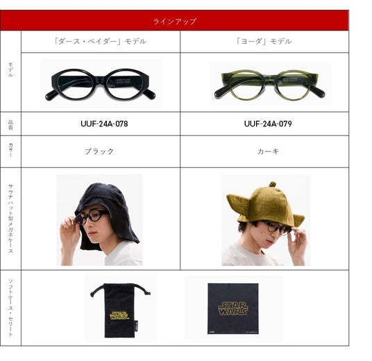 今回はシリーズ初となるキャラクターモデルとして、「スター・ウォーズ」から世代を超えて支持される、ヨーダとダース・ベイダーをイメージした特別デザインが誕生。サウナの熱気の中でも、クリアな視界を保つくもり止め加工や、フレームとレンズの耐熱温度120℃といった機能性はそのままに、ファン必携のこだわりを随所に施しました。テンプルの内側にはそれぞれキャラクターの名言をレーザー刻印し、作品の世界観を演出しています。