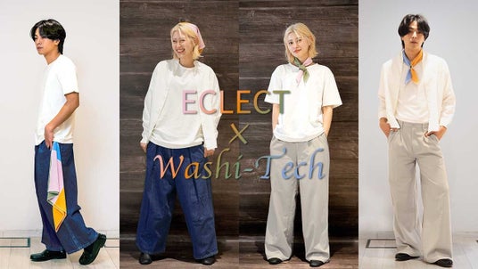 「ECLECT」のメンバー4人のキーカラーを縫い合わせたバンダナ「結(ゆい)」。ファクトリーブランド「WASHI-TECH」とのコラボにより、地球環境への負荷が少ないサステナブル素材「和紙」を100%使用したバンダナが誕生しました。しっとり、サラサラとした他の素材にはない手触りで、和紙ならではの上質な質感を演出。4色繋ぎ合わせた贅沢なデザインは、身に付ける人の感性に応じて表情を変えることができます。今日は何色をメインにキーコーディネートを作ろうかと、毎日の選択肢が広がります 。