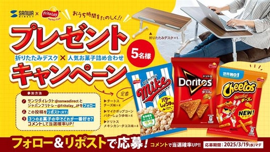 サンワダイレクトの公式X(旧Twitter)では3月7日(金)12:00より、「ドリトス」や「マイクポップコーン」などで人気のスナック菓子メーカー『ジャパンフリトレー株式会社』とのスペシャルコラボプレゼントキャンペーンをスタート!