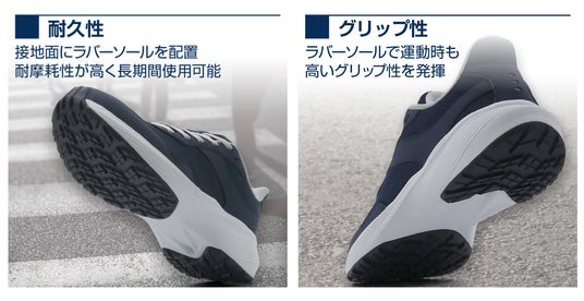 シューズの消耗の要因となりやすいソールには、ラバーソールを配置。耐摩耗性が高く、ソールがすり減りにくいので長い期間履いて頂く事ができます。また、運動時や濡れた路面などでも、ラバーソールが優れたグリップ性を発揮します。