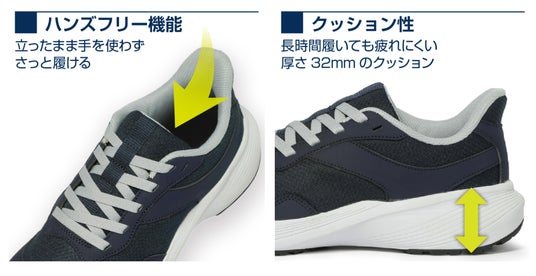 さらに、ゆったりした履き心地の幅広設計(3.5E相当)の足型と、通気性が高く蒸れにくいエアメッシュ素材で快適な履き心地をもたらします。