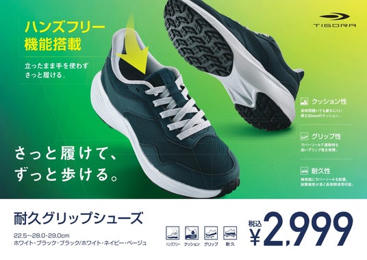 スポーツ用品販売の株式会社アルペン(本社:愛知県名古屋市、代表取締役社長:水野敦之)は、アルペンプライベートブランド「TIGORA(ティゴラ)」より、シリーズ累計売上数340万足のスポーツシューズ「耐久グリップシューズ」をリニューアルし、お手頃価格の2,999円で11月15日(金)より全国のアルペン、スポーツデポ、公式オンラインストアにて新発売いたします。シリーズの特長であるソールの耐久性とグリップ性は健在のまま、手を使わずに履くことが可能なハンズフリー機能を搭載。さらにクッション性も進化し、通勤・通学はもちろん、ジョギングや軽い運動時にもご使用いただけるスポーツシューズです。
