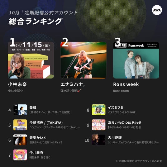 AWA株式会社(本社:東京都港区、代表取締役CEO:冨樫晃己)が運営する、サブスクリプション型(定額制)音楽ストリーミングサービス「AWA(アワ)」は、2024年10月1日(火)から10月31日(木)までに開催された、音声ライブ配信を利用した「定期配信ラウンジ」※の視聴数、開催頻度、リアクション数、フラワーチャット本数などを総合して、2024年10月の定期配信AWAラウンジランキングTOP10を発表いたしました。