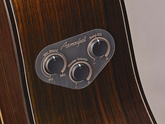 3Wayピックアップシステム「Atmosfeel」は、従来のピックアップでは拾うことができなかったギターの音成分を自然なニュアンスで再現するシステムです。アンダーサドルのピエゾセンサーで弦の振動を、ボディ内部に装着されたコンデンサーマイクで胴内の空気感を、表板裏面に貼られた薄くて耐久性のある圧電性合成紙を使ったコンタクトセンサーピックアップが表板の振動から得られる高音域を集音し、3つの音を組み合わせることでギター本来の自然なアコースティックサウンドを余すことなく再現します。