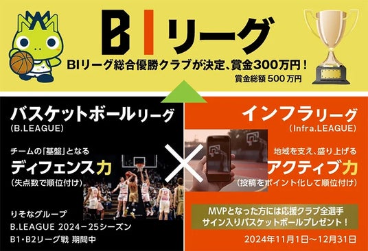 「バスケインフラリーグ(BIリーグ)」は、クラブとファン・市民の皆さまが一体となって、バスケットボールやB.LEAGUEクラブがある地域を支え、盛り上げるための参加型競技(ゲーム)です。