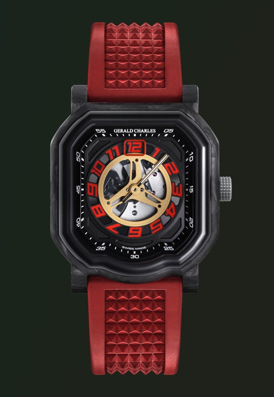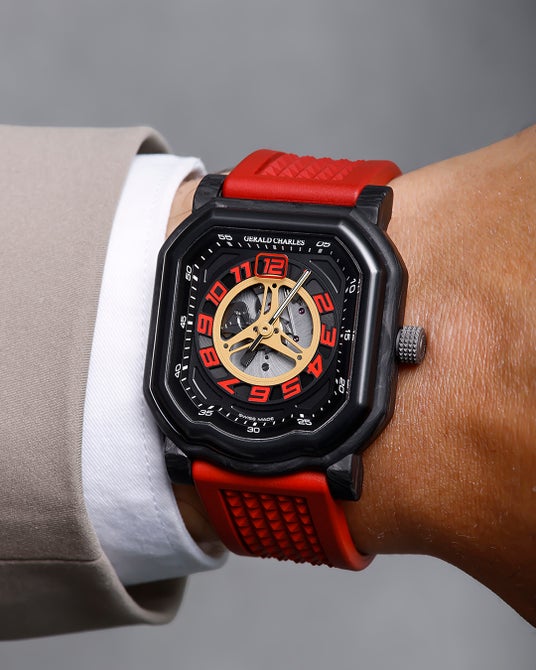 耐久性とデザイン性を兼ね備えたこの時計は、マーブルブラックのカーボンフォージドケースボディにマットブラックのセラミック製ベゼルを備え、グレード5チタン製のリューズ、ケースバック、バックルとシームレスに一体化しており、ジェラルド・チャールズの卓越性への揺るぎないコミットメントの証です。オートバイの世界で超軽量で耐久性に優れた素材として知られるこれらの素材は、この新しい時計にとって理想的でした。さらに、仕上げはレーストラックのアスファルトへの頌歌です。専用ケース構造により、10気圧/100mまでの高い防水性と5Gの耐衝撃性が保証されています。