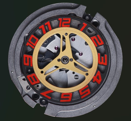 ジャンピングアワーの複雑機構は、時針がないことですぐに認識できます。時間はウィンドウまたはギシェを通じて表示され、文字盤の下に配置された大きなディスクの一部が見えます。ムーブメントの上にある回転ディスクが60分ごとにカチッと音を立て、正しい時刻を示します。時計では、時間を表示する赤い四角がガラスの内側にプリントされています。