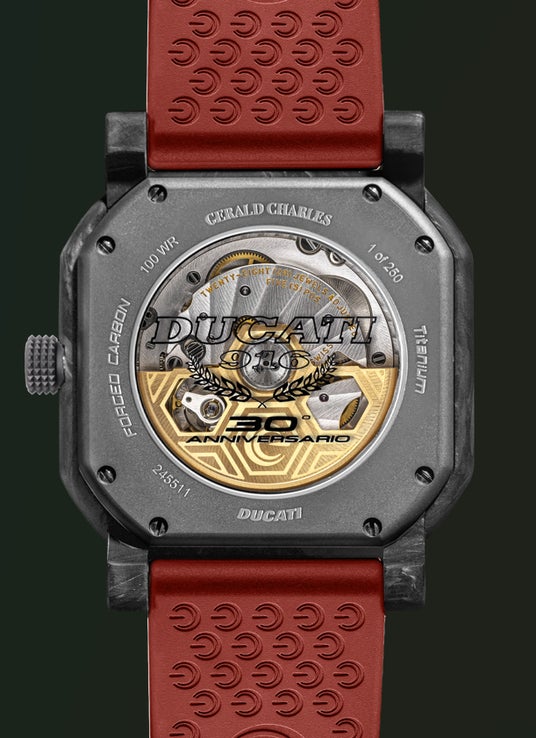 ジェラルド・チャールズは、新しいエクスクルーシブなマエストロ 4.0 ドゥカティ 30° アニバーサリー 916、Ref.GC4.0-CF-11を発表します。イタリアのモーターサイクルメーカー、ドゥカティとのコラボレーションにより誕生したこの新しいタイムピースは、伝説的なドゥカティ916モーターサイクルの30周年を記念するものです。メゾンの主な特徴を受け継ぎ、アイコニックなマエストロ製ケースとルビーレッドのバルカナイズドラバーストラップが特徴です。