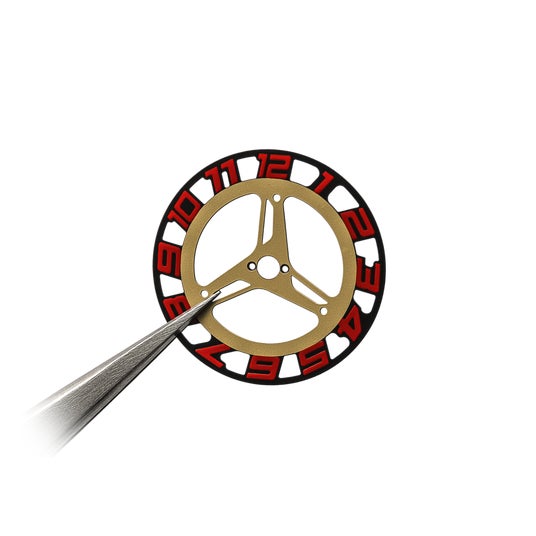 スケルトンアワー中央ディスクの輪郭を描き出すリホールとインナーパーツを備えた3段ダイヤル。