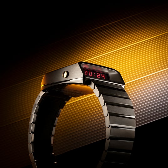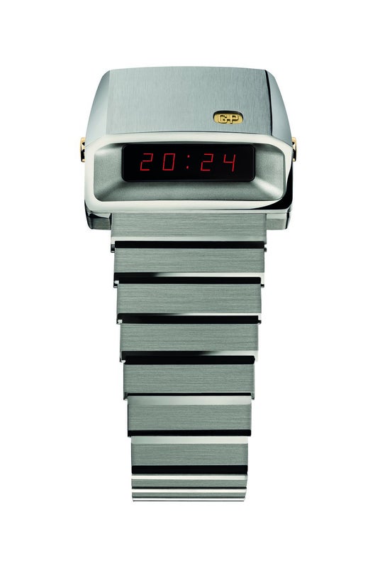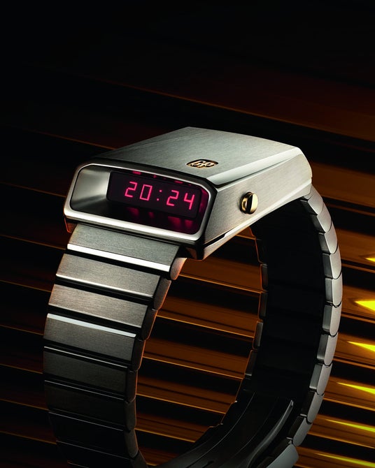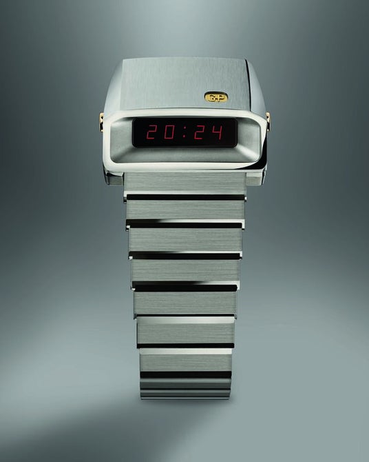その 1、2 年後には LED 表示が登場し、コンピュータメーカーも時計ブランドも当時の最先端とされたこの技術をこぞって導入しました。伝統的な機械式時計の時針と分針は、プッシュボタンを押すと表示される、鮮やかなレッドのアラビア数字に取って代わられました。興味深いのは、ウォッチに使用された初期の LED 表示は従来のラウンド型ケースに組み込まれることが多く、文字盤上のごく小さなスペースを占めるに過ぎなかったということです。