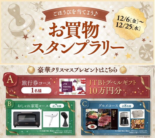 館内で3,000円(税込・合算可)以上のお買い上げでゲットできる店舗スタンプを3つ集めて、お好きな賞を選んで必要事項を記入のうえ、応募BOXへ投函いただくと、抽選で豪華賞品をプレゼント!