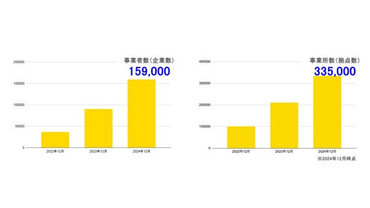 2024年12月時点の登録事業者数(企業数)は、159,000事業者でした。また、登録事業所(拠点数)は、335,000事業所でした。
