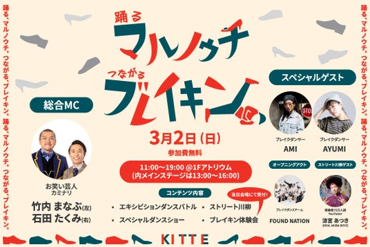 「踊る、マルノウチ。つながる、ブレイキン。~サイファーでつながる○と縁~」は、2025年3月2日(日)、東京・丸の内の商業施設、KITTE丸の内で開催されるブレイキンをテーマにしたイベントです。