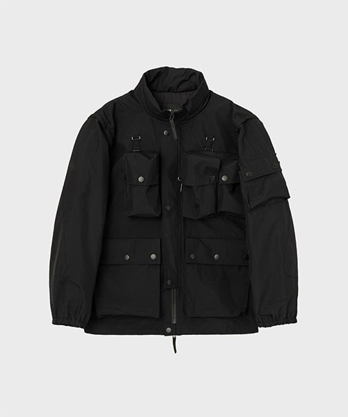 M-60の最も特徴的なマルチポケットを現代向けに厳選して簡素化し、袖はファスナーで着脱可能でベストとしても着用出来る様に変更しました。フードも衿収納にし、裾にはドローコードを追加して絞れるようにしています。背中にも大型のポケットがあるためバッグいらず。裏地はナイロンで、ファスナーには止水ファスナーを使用。袖口には本体と同色でWINDSTOPPER(R) BY GORE-TEX LABSの刺繍、反対にYOKEと+phenixの刺繍を施しています。