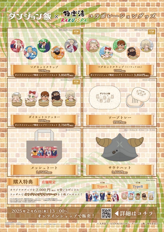 株式会社極楽湯(本社:東京都千代田区、代表取締役社長:佐藤 剛史)は株式会社GK Marketing(本社:東京都千代田区、代表取締役社長:山本 真司)と共同主催で、2025年2月6日(木)より極楽湯・RAKU SPAグループ5店舗で、TVアニメ『ダンジョン飯』とのコラボキャンペーン“冒険者たちのオアシス”を開催いたします。