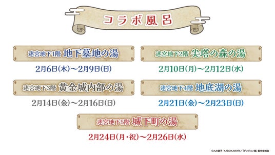 ダンジョンの階層をイメージした5種類のコラボ風呂が登場し、浴室には特別にデザインしたタペストリーを装飾します。各店舗の開催スケジュールはコラボHPをご確認ください。
