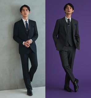 ダークグレーの3ピースにはトレンドカラーの紫のネクタイとチーフをアクセントとして合わせレトロな雰囲気のコーディネートに、定番のネイビースーツと白シャツのコーディネートには細めのペイズリー柄のネクタイを合わせて今っぽいスタイリッシュさをプラスするなど、ワンランク上のおしゃれな着こなしを演出いたします。また、特集ページではポケットチーフなどの小物の活用術やコートの着こなしまで、トータルコーディネートでご紹介いたします。