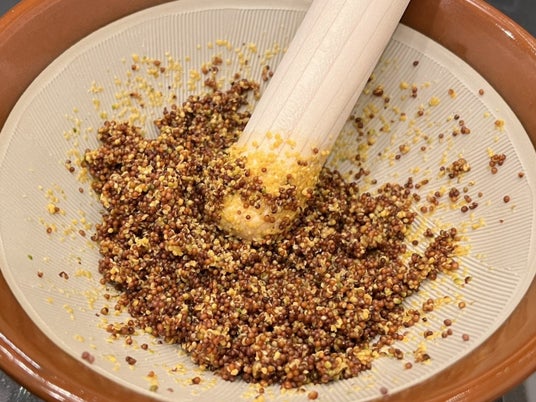 すり鉢で擦ったからし菜種に、バジル、にんにく、唐辛子、ブラックペッパーなどをお好みで加えることで、食感も風味もオリジナルの粒マスタードが完成。