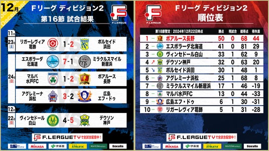 12月12日(日)に実施したFリーグ2024-2025 ディビジョン2 第16節の1試合について結果をお知らせいたします。